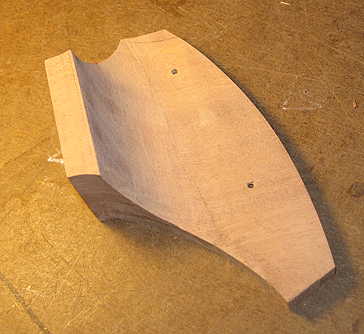 Tuesday, June 14th, 2011: What you see below took me quite a while to do, partly because at first I had no idea how to go about it. Yesterday I had cut out the harp box peghead. This morning I glued another couple of layers of mahogany to the lower half of the peghead, and then used the belt sander to shape the curve from the "heel" part of the peghead down to the first layer. That took a long time! But it did finally get done, and I think it looks okay.