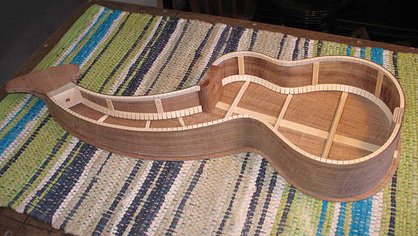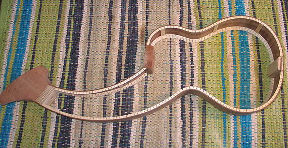 The next things I need to do are to (1) sand the insides of the sides, (2) put the side set back into the mold and sand the top and back radiuses onto the kerfing, (3) lay the side set upon the top, to see where I will have to trim the top braces so the top will fit snugly onto the sides, (4) do the same to determine where to trim the back braces, (5) glue on the top, (6) sand the back and make and glue on my label, and (7) glue on the back. At that point, I will have a soundbox!!! |