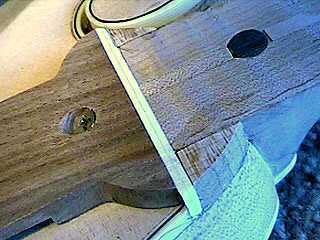 | July 24th...Today I made the fretboard extender. This piece supports the part of the fingerboard which extends over the soundboard. Siminoff suggests using rosewood for this piece, because of its stability. I didn't have any rosewood this thick, so I made mine out of a piece of walnut. Only about 1-1/8" of the extender actually touches the soundboard. The countersunk screw you see in the middle of the extender is angled towards the neck and serves to tightly pull the extender against the binding crosspiece as it is glued | ![]() |