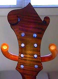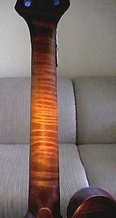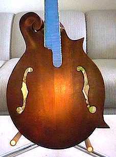 July 27th...I spent yesterday doing the final sanding (grain-raisings and sanding) of the mandolin, in preparation for doing the sunbursting. Last night I began the sunbursting process. I finished it today. I used analine dyes to do the sunburst staining. The dyes I used were powders which are soluble in denatured alcohol. I bought four colors --- yellow, red mahogany, brown mahogany, and dark walnut --- which I mixed in different combinations to get the three basic colors I wanted, in quite diluted concentrations. The yellow (Canary Yellow) was too bright and fluorescent, so I just put a tiny touch of the mahogany red in it to make it more of a golden yellow. The other two colors I ended up with were kind of a reddish-brown and a darker brown. I practiced first on some scraps, to get a feel for the technique of hand-rubbing the stain. I didn 't want to spray it on, because I wanted the grain to show more prominently, and I felt as if I had a bit more control doing it by hand. Doing the blending was kind of tricky, as the alcohol dye dries so quickly. But I found using tiny circular motions over and over again, as I rubbed the dyes in, helped to blend the colors fairly well. After I finished the staining, I let it dry. Then I sealed it by spraying on a coat of the waterborne urethane I will be using. This is to prevent the dyes from leaching onto the binding later after I have scraped the binding and put on the finish coats. |
