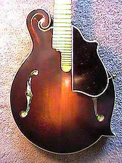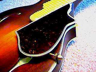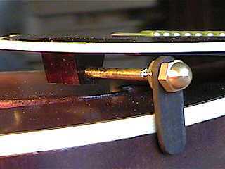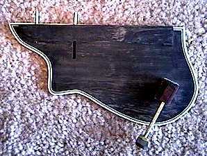 August 1st and 2nd....I spent these two days making the pickguard for my mandolin. I basically followed Siminoff's directions here, although I used some different materials than he suggested. For the pickguard, I used a 3/32" thick piece of ebony headplate material I had sitting around. I used contact cement to glue some 1/32" thick tortoise plastic pickguard material onto the top of the ebony. I then bound the pickguard with the same ivoroid/black/ivoroid binding I used on the body of the mandolin (but I cut it shorter on my bandsaw). A narrow ebony strip was glued to the bottom. Before it was glued, however, I had to drill and rout channels in both pieces of ebony to "sandwich" the two pieces of 3/32" brass rod, which protrude from the pickguard. These two rods slide into two holes drilled in the side of the fingerboard. A small block of wood was then glued to the bottom of the pickguard; this support block holds the 1/8" brass rod, which attaches to a bracket (I made mine of ebony), which screws into the side of the mandolin (into the kerfed lining). The bracket, rod, and support block suspend the pickguard above the soundbox. I learned how to use "tap and die" tools, too, as I had to make 6-32 screw threads on the brass rod and in the support block and bracket. Sound confusing enough? That's sure how it sounded to me, the first few times I read the instructions on how to make the thing. But as I got into it, things became more clear, and I think it came out okay. At any rate, it sure beats buying one from Stew-Mac for $100!!! |
