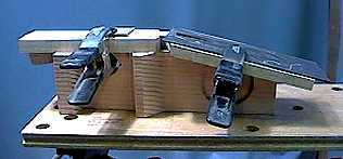 July 9...Today I made the jig pictured below, to hold the neck level as I bandsawed the peghead shape.
