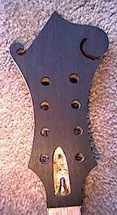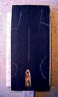 The bandsawing of the peghead went great! It was a lot easier than I thought it would be. What a difference having a good bandsaw makes! I can now follow curves accurately, without having the blade bind on me or wander off course. Next, I drilled the holes for the tuners. Yes, I know my truss rod access hole is a little off-center, but it will be hidden by the cover, so not to worry.... |