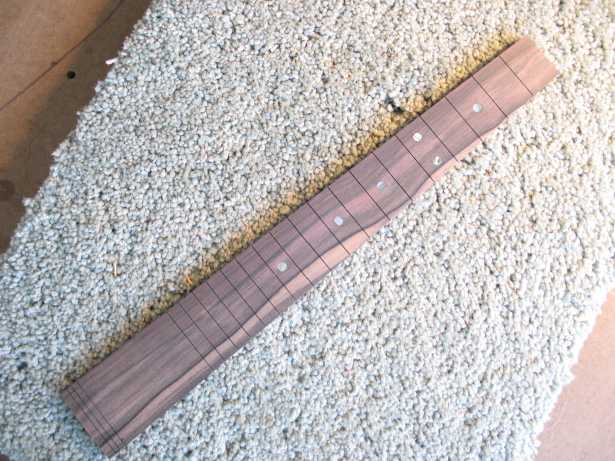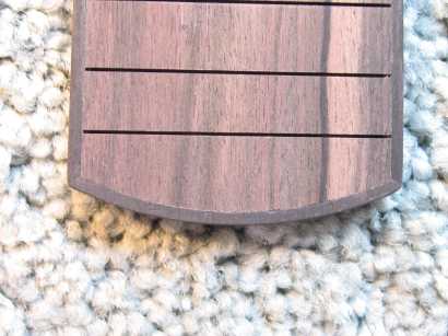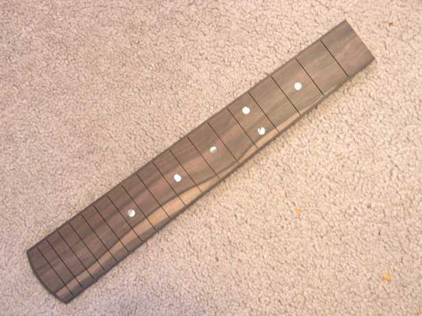 I received a lovely Macassar Ebony fingerboard blank from Hana Lima 'Ia, so I decided to use it for this ukulele. The slots you see down at the bottom of the fingerboard blank are some "test" slots I did, to check the depth of my slots. I used the Stew-Mac miter box and their new fret saw that cuts on the pull stroke. That turned out to be much easier than their old saw. Oh, yeah...I also recently had bought one of those Incra rulers (the one with the zillion tiny holes and slots). That helped tremendously in marking the slot positions accurately!!! I decided to bind this fingerboard with ebony binding. |
