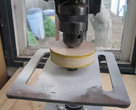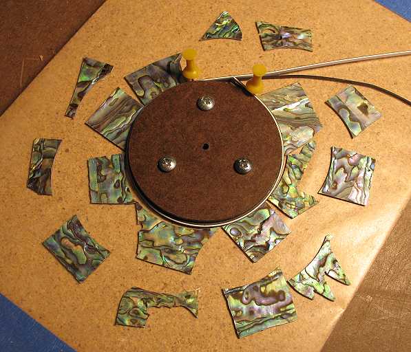 This was the first time I'd ever cut abalone rosette rings myself. I got some tips from my good friend, Michael Keller, and made this sanding disc, to sand the inner part of the ring. That was the easy part. The harder part was using a jeweler's saw to then cut the outer edge of each piece! It was very tedious work, but it came out well in the end. It was a good experience for me. |
