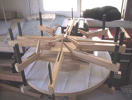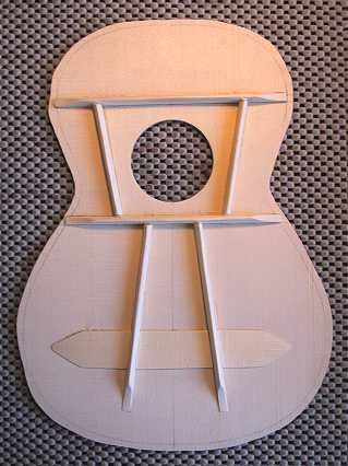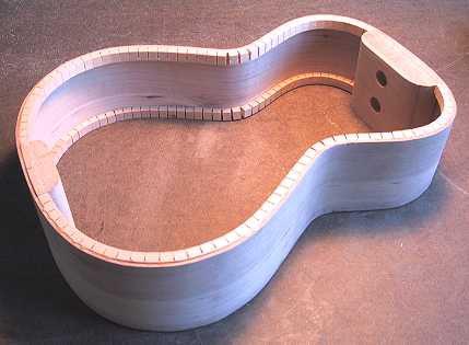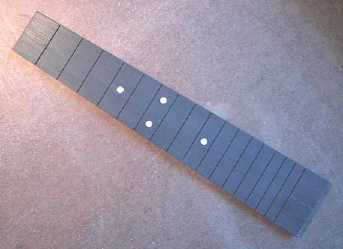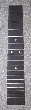 To the left I am gluing the top to the sides. I have the top set upon the 25' radius dish, and, since the top is so small, I had to clamp it by placing long boards over the side set, and clamping both ends of the boards. (The clamps wouldn't reach all the way to the sides.) Above is the fingerboard, after the fingerboard dots have been inlaid. |