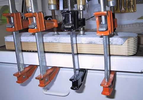After I fret the fingerboard, it always has quite a back bow, so what I do to straighten up the board is clamp it between two boards (or, in this case, between a board and my workbench surface). To the right is the fretted fingerboard. |