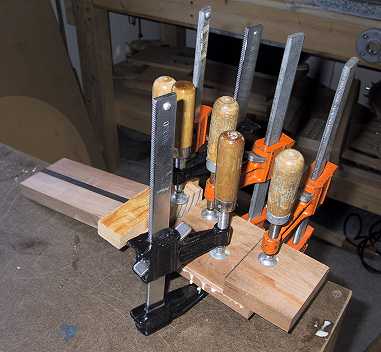 Here I am clamping a cherry veneer to the peghead. |