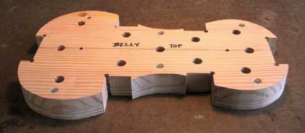 Well, I built the mold today. It's an inside mold, quite different from the kind of mold I use for building a guitar. It's made in two layers: the back (bottom) layer a 5/8" thick piece of plywood, the belly (top) layer a 3/4" thick piece of Douglas fir, planed down to approximately 1-1/4" thick at the tail end, to 1-3/16" thick at the neck end.