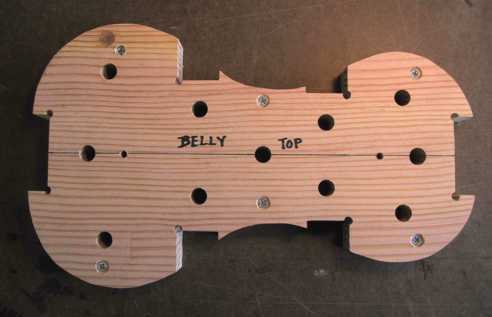 The two layers are not glued together; they're simply held together with six 1" screws. The eleven 1/2" holes drilled all the way through both layers are for dowels, which will be used later when it comes time to glue the ribs (sides) to the corner and end blocks. Rubber bands will be strung around the dowels, on the inside and the outside of the mold, to clamp down the ribs. Later, the top layer of the mold will be removed, to allow access to the ribs for gluing on the linings. The squared-off sections cut into the mold are for the four corner blocks and the two end blocks (you can see the way the end and corner blocks are inset in the template photo above).