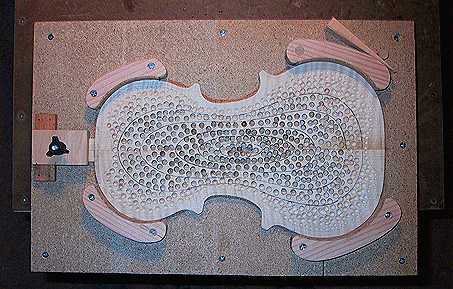 Okay, so here's what I did today, after coming home from church. I spent about six hours making the table you see to the right. It's a table to hold the top and back plates securely, so I can hollow out the inside surfaces. It is similar to my other carving table, in that I can bolt it to my workbench and it can swivel around to any position I want. Three of the cork-lined supports are fixed to the table; the fourth one (bottom of photo) swivels on a dowel and can be tightened with a wedge. (This is in case there is any slight variation in the plates.) The clamp in the upper right-hand corner is to secure the back button tab. I have lined the bottom with cork, to protect the plates' outer arches. |