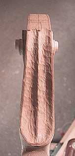Today I worked on my yard, so I didn't spend too much time on the violin. But I did manage to do a little shaping of the chin (to the left). In the photo you can also see a line 1mm in from the edges of the outside of the scroll; it runs all the way around the scroll to the pegbox. This line will later be used for the chamfering of the corners of the scroll. To the right you can see I have begun carving out the grooves on both sides of the center line on the back of the scroll. |