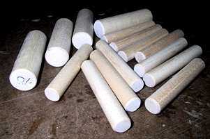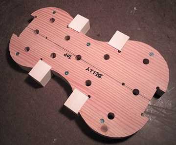 I also spent today cutting the eleven 1/2" dowels; these will be used in the mold when it's time to clamp and glue the sides to the corner and end blocks. The larger 7/8" dowels are for clamping against the outside of the sides. I also had found some close-grained clear pine at my local Home Depot, so I cut out some 1-1/4" by 1-1/4" blocks (1-1/2" long) to possibly use for my corner blocks. The photo to the left shows how the corner blocks are placed into the mold.