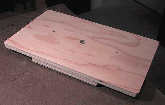 Today I made the turntable for carving the outside arch of the top and back. The turntable is 9" by 16" and is made out of some plywood scraps I had lying around. In the center is a countersunk 3" carriage bolt. I have drilled a 1/4" hole into my workbench table. The turntable can thus be secured tightly to the workbench (with one of those black clamping knobs underneath) and can be swiveled around to any position, as I sit at the end of the bench. The two wood screws protruding from the top of the turntable will grab the top or back, so clamps will not obstruct my carving area. |