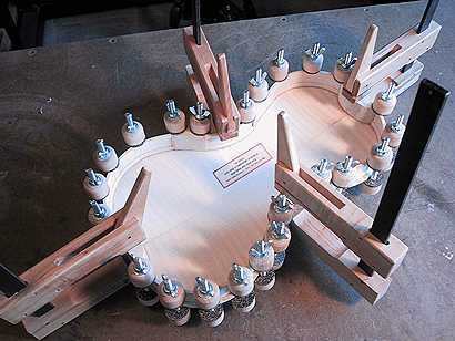 Finally, I swallowed up my courage and glued the back onto the rims. I was kind of nervous about gluing it all at once (I was afraid the hide glue would gel more quickly than I could get the rim adjusted and all the clamps on), so what I ended up doing was what I saw Derek Roberts do on his violin-making site. I put a thin sizing of hide glue on both the rim/linings and the gluing ledge of the back. Then, after it had totally dried, I clamped the rim to the back. Opening up a few clamps at a time, I used a thin palette knife heated in boiling water to melt the glue in that section. Then I reclamped the section and moved on to the next section, until I had the entire back glued. We'll see how it worked tomorrow.... |