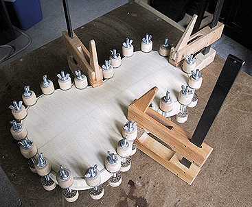Now it was time to close up the soundbox. I did it differently from the way I glued the back to the rim. I found I really didn't like that other method of using the palette knife to remelt the already dried hide glue. With the clamps holding the back to the rim, I found it was kind of difficult to slide the palette knife in between the rim and the back, so I was never really sure if I was getting to all the glue with the knife. Luckily for me, I only had a few spots where the glue hadn't melted; I simply went in there again with the knife (though it was still difficult) and remelted the glue. So, although it made me nervous, I decided to glue the top by spreading the glue all at once and immediately applying the clamps. What I was nervous about was that I wouldn't have time to get it all clamped up before the hide glue gelled. (I'm totally new to hide glue.) But I gathered up my courage and began. First, I did a dry-run by clamping it all up, so that all my spool clamps would be opened up large enough to just fit (so I wouldn't have to be fumbling around loosening the clamps while my hide glue was sitting there gelling!). I determined the exact order in which I was going to apply the clamps (and how many clamps would go in each section). I also had drawn a light pencil outline around the rim onto the top, so I would know exactly where to position the rim on the top. Once I felt as if I knew what I was doing, I took a deep breath, took my little brush, and quickly spread the hide glue on the rim and blocks, putting a little extra on the blocks. Then I got right to work putting on all those clamps!!! After I did that (and I went lightning-fast!), I wiped away any oozed-out glue. I think it worked all right.....tomorrow I will remove the clamps and see!!! |