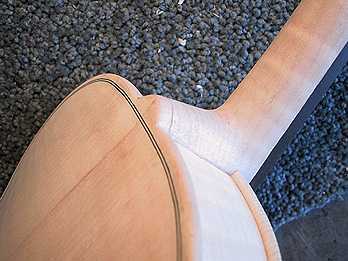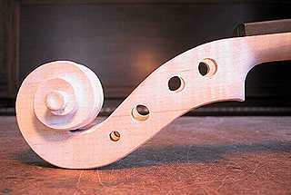 Below are a couple of pictures of what I did after my end button mishap. I reamed the holes for the tuner pegs (I've left one unreamed so you can see how much larger I had to ream the holes), angling the reaming slightly towards the body. I reamed them so the tuner pegs just protrude a millimeter or two past the other side of the pegbox. I then reamed the hole for the ebony tailpin, for a tight fit. The tailpiece will be anchored to this tailpin. |