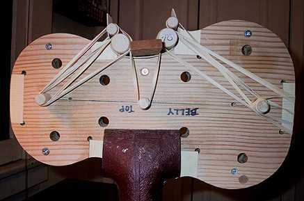 The bending of that one C-bout took me over an hour!!!! I took it really slowly, not wanting to crack that beautiful flamed maple rim. But finally it was done, and I clamped the rim to the mold, to let it set. To the left you see a close-up of the method the Ossman book uses for holding the C-bout to the mold. The 1/2" dowels extend out on both sides of the mold. Rubber bands stretched around the 1/2" dowels and the larger 7/8" dowels on the outside of the mold pull the rim tightly to the form.