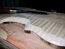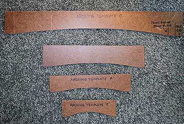 The first thing I did today was to make the four basic arching templates. The top one is for the longitudinal arch; the lower three are for the arches across the lower bout, the upper bout, and the waist. Next I used my marking gauge to scribe the 6mm starting depth of the plate's edge (it will become thinner later). I then marked a line about 10mm in from the edge; this will be the shoulder area of the plate. ![]() |