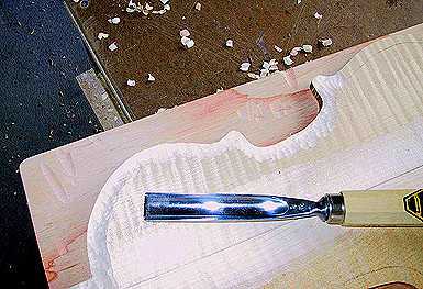 To the left I have begun carving the shoulder area down to the scribed line. As I carved with the gouge, I found myself sometimes unintentionally gouging my workboard as well as the intended object, the maple back plate! Even with a sharp gouge, that maple is pretty tough to carve! It took me a while to get the knack of which direction to go in the carving (so as not to tear out chunks of maple!), but I soon got the feel of it. Below you can see how I am carving down to the 6mm scribed line.