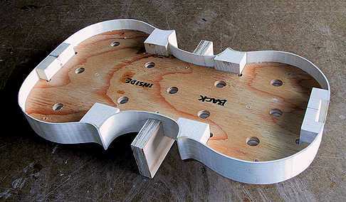 Now the rim is only held by the lower mold piece. To ensure that the C-bouts are still held closely to the mold, I cut out a piece of plywood to hold the C-bouts tightly to the mold.