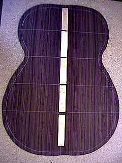 July 9, 1999 . . . . For the back, I have already joined the back halves, inlaid a white/red/white thin backstrip, cut 1/2" outside the guitar-shape outline, and marked the spots for the braces. Here I am gluing in the spruce back reinforcement strip. I clamped down my metal straightedge at half the width of the backstrip from the center line. Against this, I glued down the back reinforcement strip, clamping it down with a single wood bar.