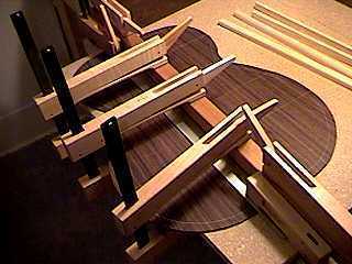 July 11, 1999 . . . . To the right is the back, after it has been braced and the braces shaped. I used the go-bar deck, with the back sitting atop the 15-foot-radius dish, to glue on the braces.