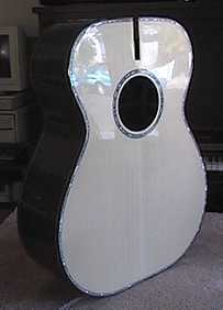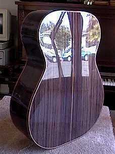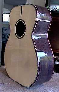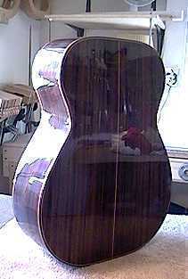 August 7, 1999 . . . . I waited four days before doing the wet-sanding and polishing. I just used water (with a little dishwashing liquid) and the full set of Micro-mesh sanding papers. I used all nine grits (1500,1800, 2400, 3200, 3600, 4000, 6000, 8000, 12000). By the time I had reached the 12000 grit stage, the guitar was almost as polished as you see here in these photos. But the final use of Finesse-It, Meguiar's #9 and #10, brought the finish up to the gloss you see here. I did it all by hand rubbing, no buffing wheels or electric polishers. I feel safer about it that way (I have in the past tried using a lamb's wool bonnet on a portable polisher, but sometimes ended up melting some finish!). |