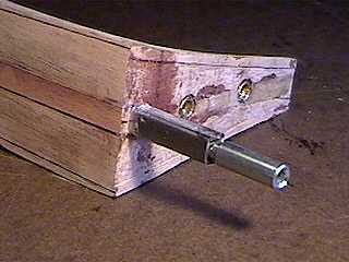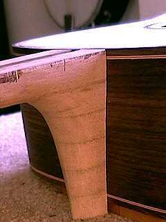 In this photo, you can also see where, in sanding for the neck angle, I have managed to sand through to the 1/2" dowel I've inserted through the heel (so the inserts won't have to bite into end grain). I've used some epoxy to fill in some gaps here. |
