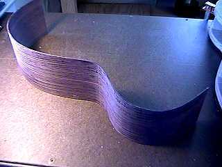 July 1, 1999......I went to the hobby shop and bought 18" pieces of 3/32" thick walnut and mahogany, to get a feel for how to use the side bending form. I soaked the walnut piece in water for about five minutes. Then I put the heating blanket on top of the form (atop the aluminum sheet), laid the walnut on top of that, and placed the second aluminum sheet over that. At this point, I turned on the heating blanket for two minutes (it has a timer). I set the waist caul over the aluminum sheet, and slowly started clamping it down. Once the waist was clamped down (it didn't take long at all --- the wood became pliable almost immediately!), I slowly started pressing the ends of the sides down. I turned on the heater timer once again to two minutes. Once the ends were close enough, I inserted the eyebolts holding the ends of the top aluminum sheet into the slots in the base of the form, and tightened them with the wingnuts. That done, I placed the 6" aluminum bars over the ends of the top sheet and clamped those down.