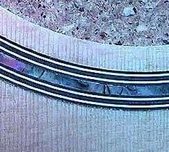July 14, 1999 . . . . I waited a few days before I scraped down the rosette, after I had glued in the abalone strips with Duco cement, to make sure the glue had cured long enough. |