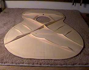 July 15, 1999 . . . . I glued the top braces in yesterday, using my go-bar deck. Today I carved the braces. The portions of the braces on the bass side have been carved a bit more than the treble side, hopefully to give more of a bass response. I have also drilled a hole in the upper face brace and carved an area in the flat upper graft, to allow for easier access to the truss rod adjusting nut. |