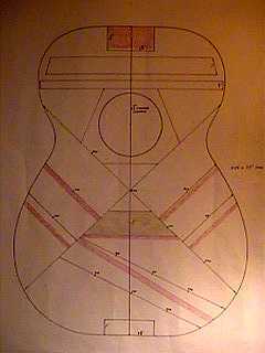 July 5, 1999 . . . . So far, all I have done with the top is join the two halves and draw out a bracing plan. At first I drew out the plan with two tone bars and two finger braces. But since then, with suggestions and ideas from the good people at MIMForum, Frank Ford, Mark Blanchard, and Coop, I've kind of decided to use one tone bar and maybe two finger braces. The red braces are my revisions. I'm still waiting on an order of abalone strips, so I can't do any more on the top yet. The next steps will be the soundhole rings (with abalone) and then the bracing. July 11, 1999 . . . . ![]() |