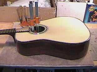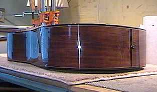 THE FOLLOWING WEDNESDAY.....Well, it just about killed me to wait (luckily, I had the weird classical to work on in the interim), but I managed to withhold myself from touching the dreadnought until today, Wednesday. Today I wet-sanded the finish. I used Micro-Mesh cloth abrasives to rub down the finish. I started with their 2400 grit (probably equivalent to an 800 or so grit sandpaper), wet-sanding the finish with water and a little dish detergent. I used that grit till the finish was totally dull (no shiny spots). Then I used each successive grit of the Micro-Mesh (3200, 3600, 4000, 6000, 8000, 12000). By the time I got to the 12000 grit, the guitar's surface was just about mirror-like! I then used Finesse-It II, Meguiar's #9, and Meguiar's #10 polishing compounds to polish it up. I decided to do it all by hand this time; I didn't want to run the risk of melting any of the corners or anything this time with the electric polisher I've used in the past. It took more elbow-grease, but it still gave nice results. It took me about 3 hours, I think, to do the soundbox, and an hour to do the neck. After I did that, I removed the finish underneath the fingerboard extension (that's the only part that gets glued with my bolt-on neck system) with some paint-stripper, and glued on the neck. Tomorrow I'll figure out where to place the bridge, remove the finish at that location, and glue on the bridge.... |