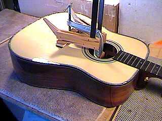 Above, I'm gluing the fingerboard extension of the neck to the soundbox. To the left, I'm gluing the bridge. I have three cauls shaped to fit the top of the bridge, and backed with sandpaper so they don't slip around. Underneath the bridge, I have placed the bridge caul I made to fit over the soundboard braces and maple bridgeplate. To determine the placement of the bridge, I used Cumpiano's method. I measured from the nut to the 12th fret, then used that measurement plus .15" compensation, as my measurement from the 12th fret to the middle of the saddle. I also centered the bridge and made sure it was parallel to the frets. |