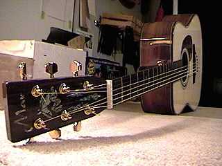 Well, I finally finished it! Last night (Thursday), after I had glued the bridge on, I worked on the rough-shaping of the nut and saddle. Today (Friday), I drilled the bridge pin holes, filed out slots in the front of the bridge pin holes, attached the tuning machines, and strung 'er up. I decided to try Cumpiano's method of figuring out how tall to make the saddle (you measure the clearance between the fret and the string at the 12th fret, subtract from it your desired final clearance, then remove twice that result from the top of the saddle --- got it???). It worked like a charm. After I adjusted the saddle, I then worked on filing down the nut slots until I got the action I wanted. |