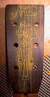 | Last summer I built a Size 5 guitar for a teacher friend. At that time, he knew he also wanted a dreadnought with similar designs and appointments. But, as I was also building another guitar that summer for a customer, I couldn't build his dreadnought then. So, here I am, doing the "horse inlay" a second time! (The teacher friend's name means "horse" in Chinese.) |