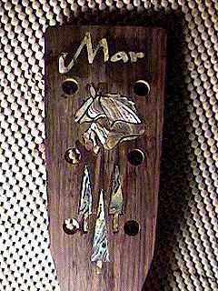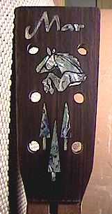 Here's the peghead after I have filled the gaps and sanded it down. In the sanding, some of the abalone pieces changed their colorations and markings, but, still, the colors will look quite brilliant under the final finish. It's hard to see the abalone's true colors here. In this photo, I dampened the peghead to try to bring out the approximate colors, but the camera didn't quite capture what it really looks like! |