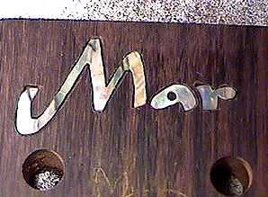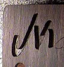 Okay...I've routed the first cavity, for the letter "M" of the customer's name. So far, so good! To rout the cavities, I used my Dremel fitted with the Stew-Mac router base, with a 1/16" down-cut, left-hand spiral carbide bit. |