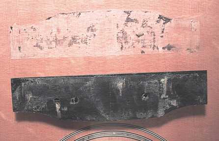 Saturday, August 21, 2004 . . . . I spent a few hours preparing to reglue the bridge onto the guitar top. First I scraped and sanded the bottom surface of the bridge and scraped the gluing surface on the top. Then what took me the most time was repairing the finish around the bridge location. I did that by sanding down any rough areas, applying more waterbase finish layer by layer, and then wet-sanding and polishing it all, to try to get it as close to the original finish as I could. I then drilled two 1/16" holes in the saddle slot. I put two layers of masking tape around the bridge location, set the bridge in its place, and clamped it down with one center clamp. I then drilled through the previously-drilled holes in the saddle slot, into the soundboard and bridge plate. Using two 1/16" drill bits as locating pins, I then glued and clamped the bridge in place. Whew!!! Mission accomplished.