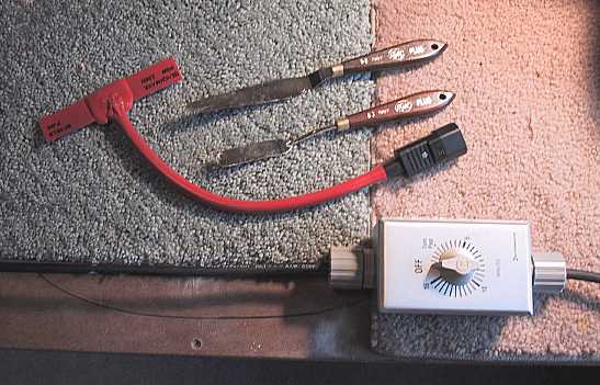 Friday, August 20, 2004 . . . . Well, I did it!!! The bridge heating blanket arrived today, so I got to work on removing the bridge this evening. It took me about 1-1/2 hours, but it came off fairly cleanly, considering this was the first time I'd ever done this sort of thing! I was really nervous doing it, but, with lots of patience and carefulness, I think I did okay. Enough drama for today . . . . I will tackle cleaning the gluing surfaces up and repairing the finish around the bridge area (mainly the section where the bridge slid over the finish on the front bass edge) tomorrow. After that's all done, I will reglue the bridge --- but this time, I will definitely use two locating pins drilled in the saddle slot!!!! Here are the tools I used to remove the bridge. I set the timer for 5 minutes at a time --- I probably could have set the timer for a longer period, as it ended up taking quite a bit longer for the glue to soften and I had to keep repeating the heating process --- but I wanted to play it safe.