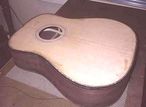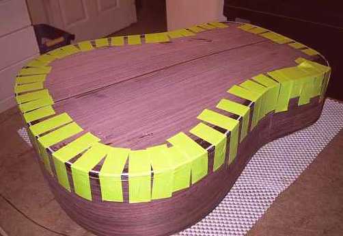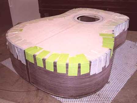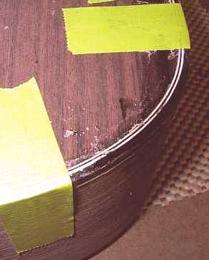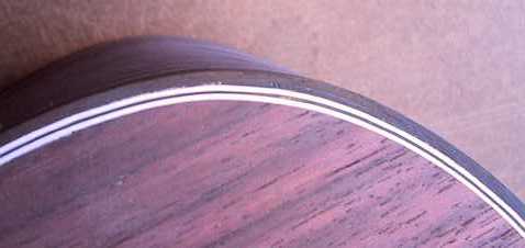 Thursday and Friday, July 1-2, 2004: I glued up the binding today -- first the back binding (ebony binding with w/b/w plastic purfling), then, in the evening, the top binding (ebony binding with abalone purfling between two b/w/b plastic purfling strips). For the back, I glued the binding in first with Titebond, with the plastic purfling dry; then I glued in the plastic purfling with Duco. On the top, I did it slightly differently; I used superglue for the purflings and abalone instead. Using the superglue worked better than using Duco, as the purfling didn't swell up and I didn't get the messy Duco all over my fingers! Here are some photos:
