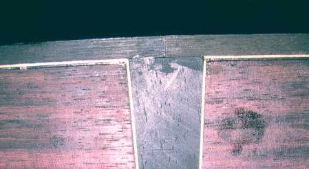 Another "boo-boo" --- at the top of the end graft miter area, I was using the router to trim the top of the end graft wedge and managed to also deepen the ebony binding ledge a little on both sides of the wedge. I felt so distraught about this! But epoxy came to my rescue once again!!! I mixed up some rosewood dust with epoxy and filled those two gaps, resulting in another "no gap" fix, which you can see to the right. Even if you look closely, you can't tell there was a gap! Whew!