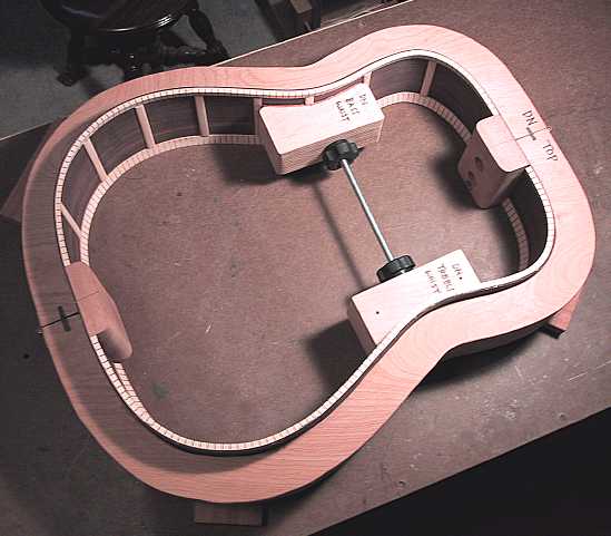 ABOVE: Here is the sideset, after I have bent the sides and glued in the mahogany head and tail blocks, basswood kerfing, and popsicle stick side braces. This will be a bolt-on neck, so in the headblock you can see the two bolt holes and the hole for the Hot Rod truss rod. |