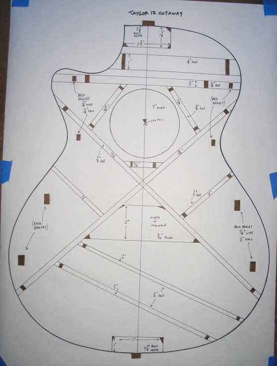 Monday, June 19th, 2006: To the right is the plan I spent today figuring out and drawing up. I first traced the outline of the guitar shape using the Taylor 12-size outside mold which I had bought from John Hall of Bluescreek Guitars. This was not a cutaway-model mold, so I then used a tracing of a Taylor Grand Concert (which the people at Guitar Showcase in San Jose kindly let me do) to draw the cutaway portion. All I had to go by was a tiny picture of the Grand Concert bracing (below) which Taylor supplies on their website. I enlarged it a bit, drew some gridlines over the picture, and came up with what you see to the right.