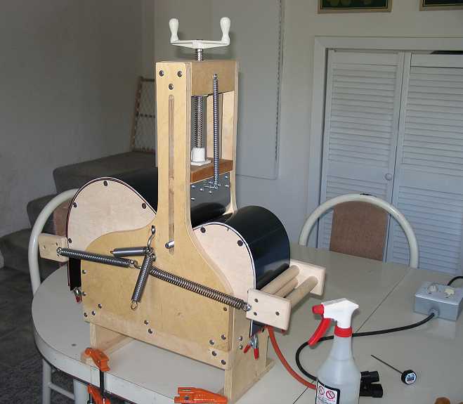 Here I have bent the non-cutaway side of the guitar in the universal side bender which I purchased from John Hall of Bluescreek Guitars. After thickness-sanding the sides to around .090" with my Performax 10-20 sander, I drew and cut the taper on the side. I then marked the waist. I wet the side, wrapped it in parchment paper and made the "sandwich" of a spring steel slat / the heating blanket / the side / a second spring steel slat. I then put the "sandwich" into the bender, lining up my waist mark with the vertical center slot of the bender. I turned on the heating blanket and waited until the temperature reached around 220° F (I had inserted a digital thermometer in between the blanket and the slat so I could monitor the temperature). At that point, I began slowly cranking down on the waist caul, until the waist was almost snug. Then I attached the lower bout caul to the springs and slowly pulled on the caul until the lower bout was fully bent. Ditto for the upper bout. When both bouts were bent, I then snugged down the waist fully. I turned off the heating blanket, and waited for it all to cool down before I removed the side from the bender.