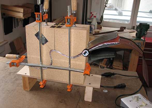 Still being a bit nervous about bending even the rosewood cutaway by hand, I made up this jig which I had seen on one of the users' forums. This photo is just to show how it goes together — I'm not actually bending yet! I traced the waist and cutaway section onto a 4" thick stack of particleboard, cut it out into three sections on my bandsaw, and hinged the top two sections. I stuck aluminum tape onto the mating sides. The heating blanket is a 25" one that I have used for my ukuleles, just right for this job. The intent is to use the blanket to relax the wood, and then slowly ease it into the cutaway shape by slowly clamping the pieces of the jig together. |