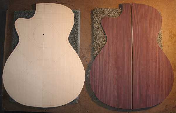 Sunday, July 2nd, 2006 Well, I have my computer back!!!! I got a call this afternoon from the Apple Store, and I just picked it up. I was surprised it only took two days. They totally replaced my "midplane" (motherboard) and the power supply. It's running fine now....what a relief!!! It's much easier doing these web pages on this computer, rather than on my little laptop.... Yesterday, once again, I didn't do too much, because I had to have a plumber come over to fix some pipes that were clanging and clattering every time my automatic lawn sprinker system shut off. But that's all fixed now, and I can get back to the guitar. As you can see below, I have joined, thinned, and cut out the top and back plates. After much consideration, I decided to go with the East Indian rosewood for the back, instead of the Malaysian blackwood (I'll save that for another instrument). I think it will just make a better match this way. The top is Carpathian spruce, which I've never used before. I think it should make a beautiful guitar!