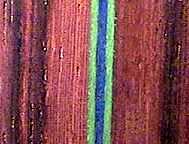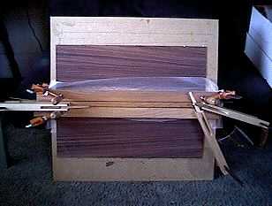 ![]() Gluing the back. In the same way I joined the top, here I am joining the two halves of the back. I first jointed the center seam of the two halves of Indian rosewood, using my hand jointer. Then I made a thin green/blue/green inlay strip (from the veneers shown on the "Planning" page) to use as the back center inlay. I glued the two rosewood halves and center inlay strip together, clamping them together with nails placed on both sides of the rosewood halves. Straight wood strips over waxed paper hold it all flat.