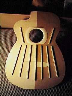 To the left I'm gluing the two cross braces, the upper transverse brace, and the V-fan braces. I have slightly arched the bottom (gluing) edge of the lower cross brace. Below, the finished braced top.